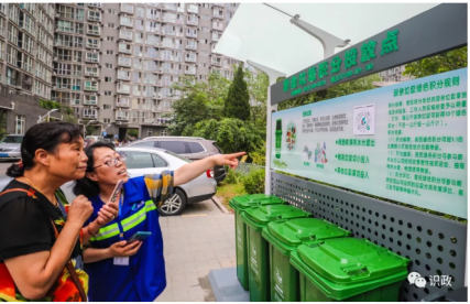 朝阳区白领家园小区,志愿者指导居民分类投放垃圾